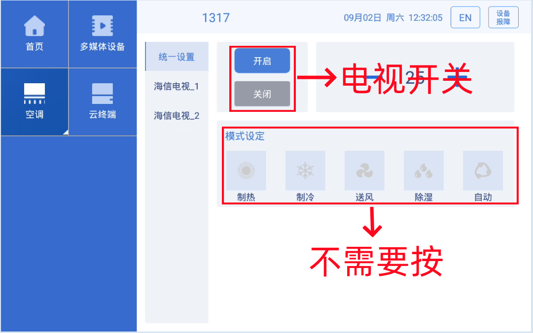 空调:选择统一设置来开启和关闭(两台电视同时控制)