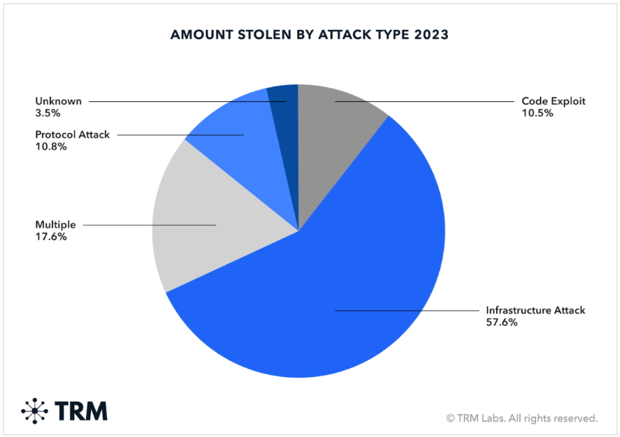 数据还表明,今年被盗总额的近 60% 可归因于基础设施攻击,犯罪分子通过攻击获取服务器、网络或软件的访问权限。同时,其余部分是通过代码漏洞、协议攻击等方式对智能合约(自执行程序)进行攻击的结果。