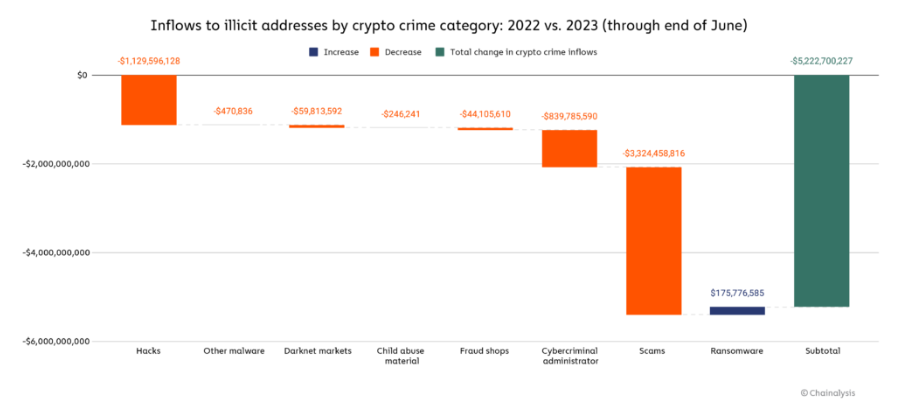 与此同时,虽然今年上半年诈骗活动有所减少,但与加密货币相关的特定类型的犯罪却有所增加:勒索软件。事实上,根据 Chainaanalysis,至少在当时,这是今年唯一增长的与加密货币相关的犯罪类型。截至 6 月,犯罪分子勒索了至少 4.49 亿美元,比 2022 年同期增加了 64%,2022 年,随着大型组织改进网络安全和数据备份实践,勒索软件造成的损失下降,他们可以拒绝支付赎金。