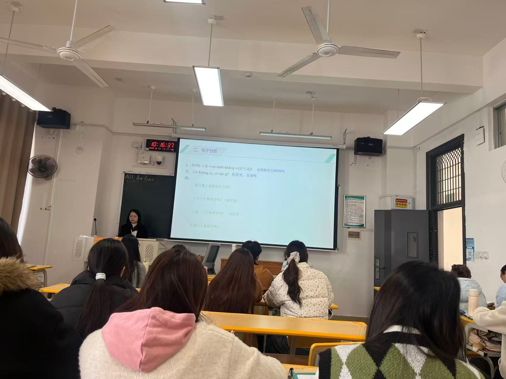 活动中,教师们观摩了以实际应用为导向的越南语口语教学,授课教师通过情境模拟、互动练习等方式引导学生提升口语表达能力,课堂氛围活跃,充分体现了语言应用与实践结合的教学理念。