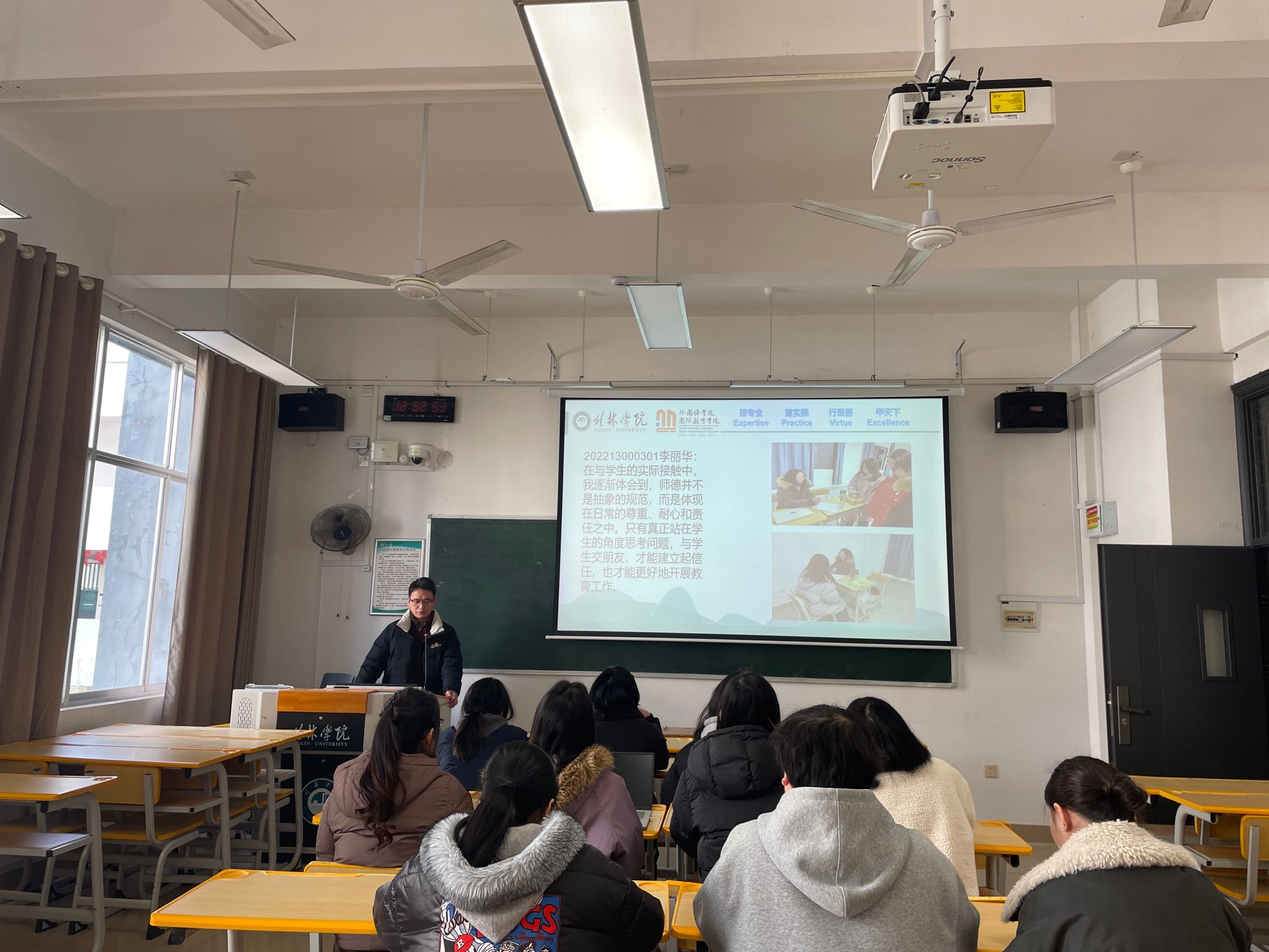 1月6日召开首次研习会议,庞一飞老师对实习生圆满完成实习任务表示祝贺,详细阐述了研习活动的重要意义,并明确了具体要求。实习生按实习单位分组,围绕师德体验、教学实践、班级管理、教师专业发展四大维度,通过PPT展示典型案例分析、教学实操复盘等内容进行汇报。庞老师特别强调,研习需突出问题导向与成长叙事,鼓励大家真诚反思、坦诚交流,在思想碰撞中凝练“教育初体验”