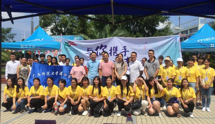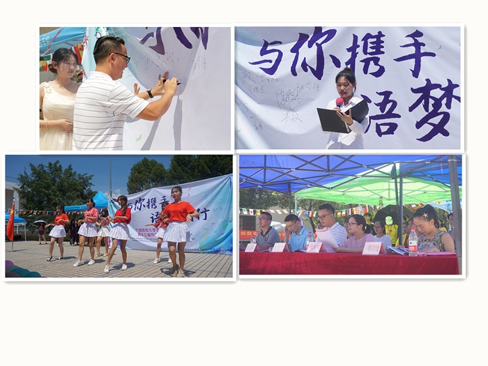 9月21日中午,外语系第十三届外语文化节开幕式在食堂小广场举行,本届外语文化节以“与你携手,语梦同行”为主题。出席本次活动的嘉宾有学生事务部副部长、校团委书记陈俊杰,外语系副主任张超峰,外语系党总支副书记林凤凤,外语系团总支书记韦微、副书记陈嘉乐,校级组织代表以及各系代表。