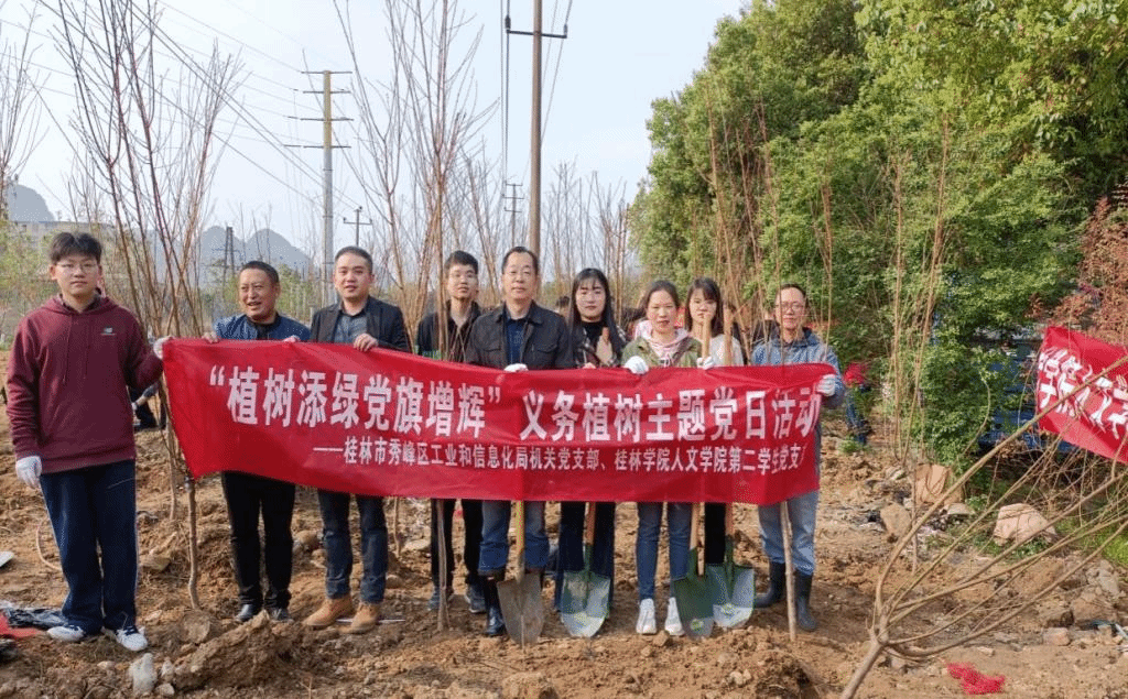 早春时节,乍暖还寒,大地萌动,万物复苏。为全面贯彻落实习近平生态文明思想,践行绿水青山就是金山银山理念,进一步增强大学生党员的植树意识,激发他们爱绿、护绿、建绿的热情。2023年3月10日,人文学院第二学生党支部与秀峰区工业和信息化局机关党支部在桂林市秀峰区桃花湾共同开展了“植树添绿党旗增辉”义务植树主题党日活动。秀峰区副区长陆军、工信局局长韩路、副局长樊众兵、人文学院第二学生党支部书记石仁春以及人文学院第二学生党支部部分教师学生代表参加了此次活动。