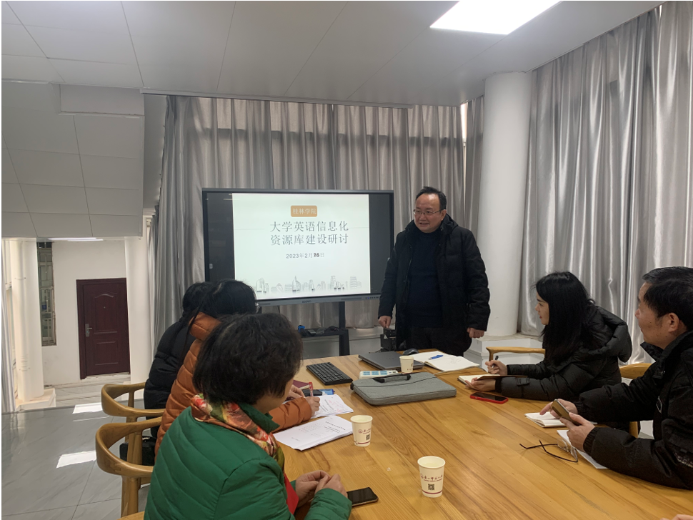 2月26日,大学英语信息化资源建设研讨会在广西师范大学国家重点实验室召开,何玲副校长携本院教师与校外专家齐聚一堂,探讨了大学英语资源库建设的相关问题。讲座分为三个部分,首先是针对目前的教学现状,以提升教师技能为目的,陈三明教授详细介绍了现有的数据库和数据库框架类型,为教师们演示了部分操作流程。接着陈教授分享了丰富的语言类信息化数据库案例。在随后的教师研讨环节,教材资源建设团队教师依次阐述,针对数据库建设的条件、现状和相关问题等展开讨论,最后根据大学英语教学现有思路提出各自的意见。