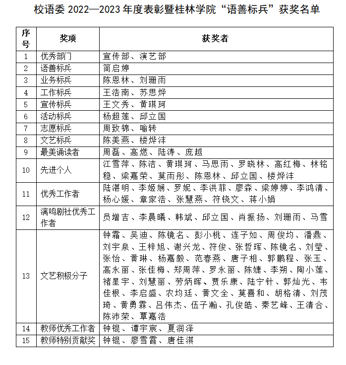 附校语委2022-2023年度表彰暨桂林学院“语善标兵”获奖名单: