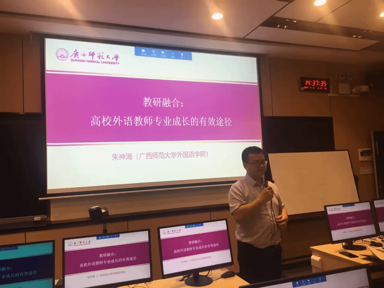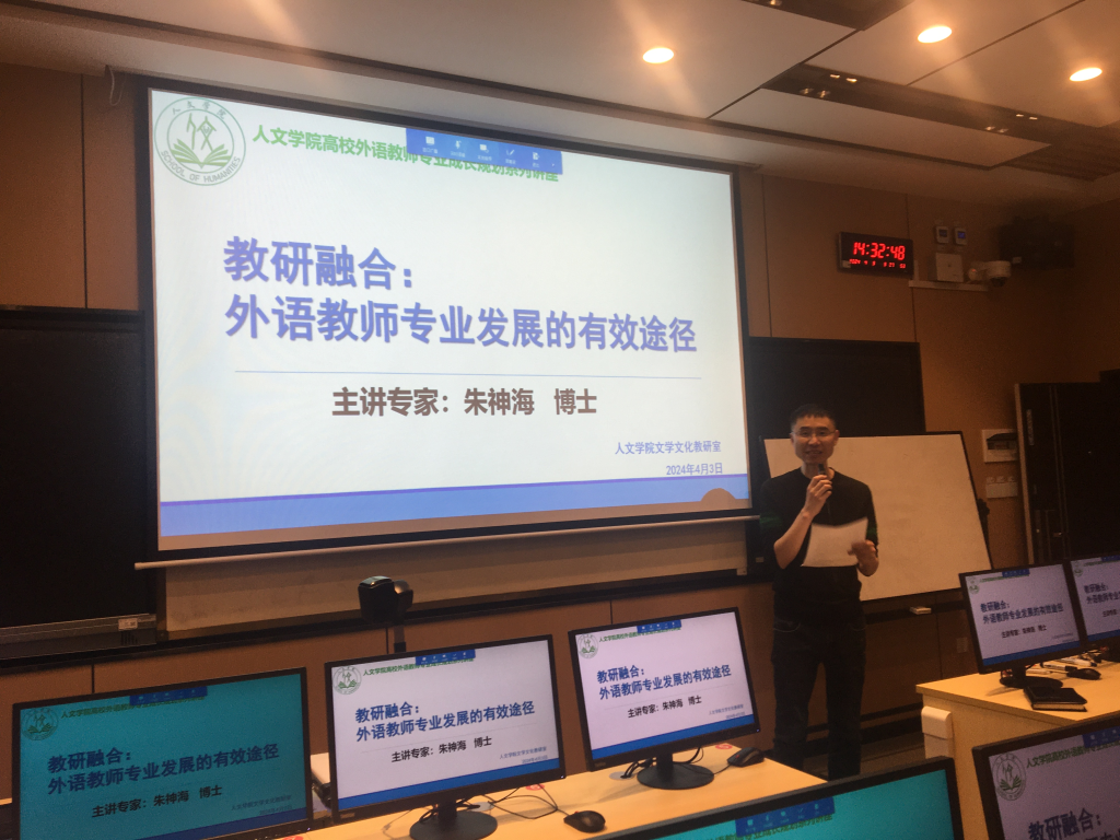 为了进一步加强教师队伍建设,提高外语教师专业能力和水平,4月3日下午,人文学院特邀广西师范大学外国语学院副院长,教授,硕士生导师朱神海博士为老师们做了一场主题为“教研融合:外语教师专业成长的有效途径”的专题讲座。本次讲座由副院长张超锋主持,学院外语类专业全体教师参加。