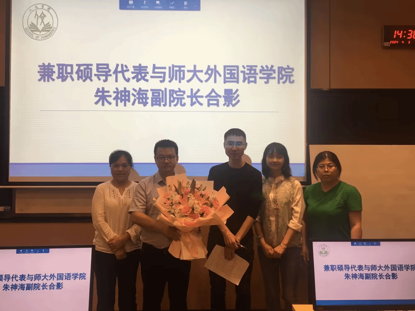 讲座正式开始前,为感谢朱神海博士对学院外语教师申报广西师范大学外国语学院硕士生导师的大力支持,特安排了兼职硕导代表发言并进行了合影留念。