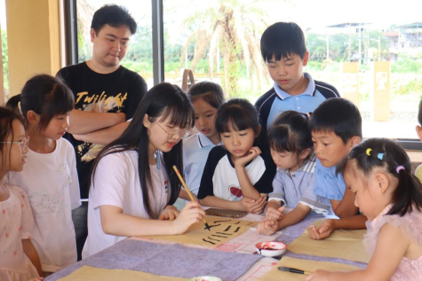 在书法活动中,团队成员以生动有趣的教学方式,深入浅出地讲解书法的基本笔画、结构布局及背后的文化内涵,让孩子们在轻松愉快的氛围中感受书法的魅力。在教学中,留守儿童们拿起了毛笔在宣纸上慢慢的练习,逐渐感受到了汉字的魅力并喜欢上书法,最后许多小朋友还表示自己要把写的书法挂在家里展示。