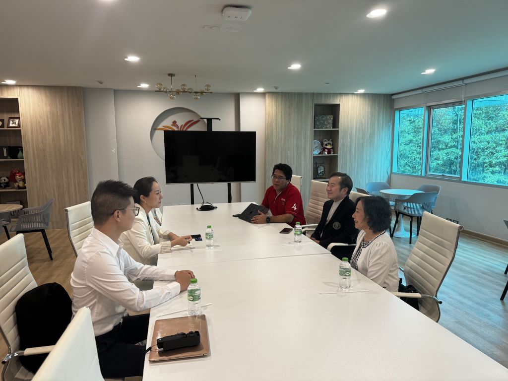 随后,人文学院副院长与泰国商会大学泰中学院的院长等代表进行了座谈。座谈中,双方就多个议题进行了深入交流。泰国商会大学泰中学院院长详细介绍了我院学生在商会大学的学习和生活情况,对同学们的表现给予了充分肯定。双方就9月中旬即将来商会大学实习的6名汉语国际教育学生的各项细节进行了落实,包括实习岗位、指导老师、生活安排等,确保实习工作顺利进行。双方还就未来合作事宜进行了广泛沟通。人文学院副院长表示,希望与泰国商会大学泰中学院在师资队伍深造、学术研究、联合培养等方面进一步加强合作,共同推动中泰教育交流事业的发展。泰国商会大学泰中学院院长积极响应,并提议双方可以开展更多形式多样的交流活动,增进两校师生之间的了解和友谊。