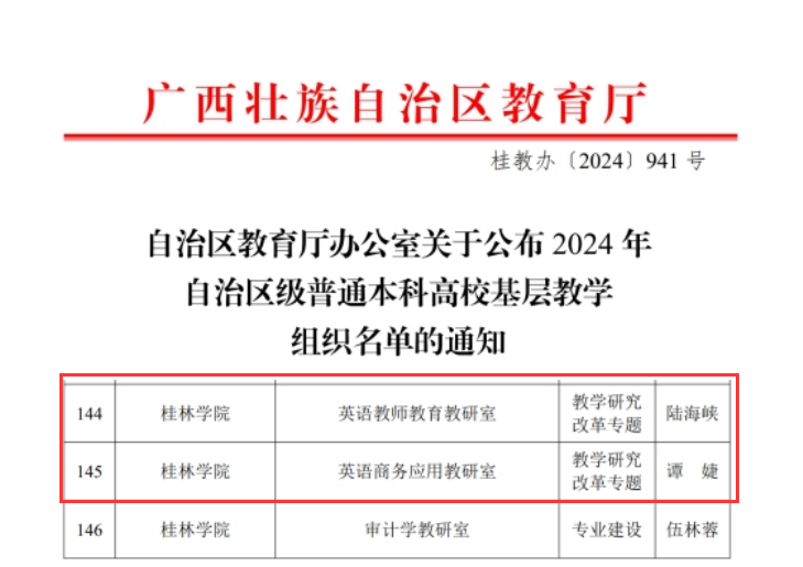 近日,自治区教育厅办公室印发《关于公布2024年自治区级普通本科高校基层教学组织名单的通知》(桂教办〔2024〕941 号),学校3个教研室获评2024年自治区级普通本科高校基层教学组织,我院英语教师教育教研室、英语商务应用教研室位列其中。