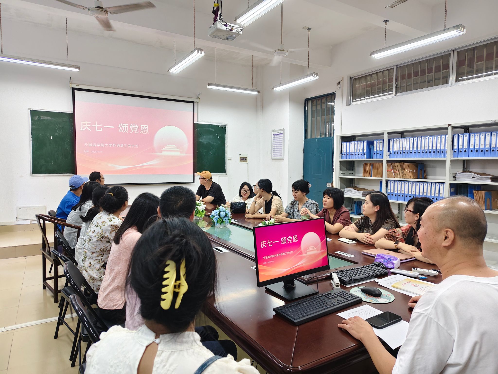 7月1日,大学外语教师党支部在2108会议室开展“庆七一,颂党恩”主题党日活动,全体党员齐聚一堂,通过重温入党誓词、分享入党初心、探讨党建与外语教育融合等环节,深入学习习近平新时代中国特色社会主义思想,强化“为党育人、为国育才”的使命担当。