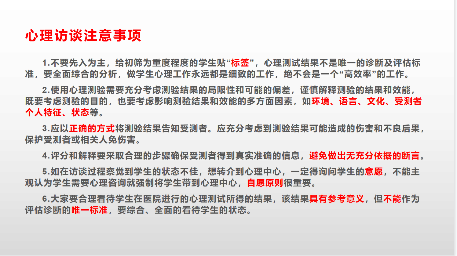 会上大学生心理健康教育与咨询中心教师首先就本次2022级新生心理健康普测的结果及辅导员二次访谈时可能遇到的注意事项进行了详细的讲解。并且就着如何看待学生的心理测试结果也进行了详细的解说。此外,心理健康教师与辅导员就我校心理健康教育工作目前存在的重点与难点进行了研讨。