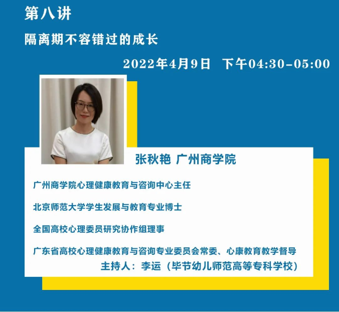 由于疫情防控的工作需要,同学们长时间处于相对封闭的环境,容易产生枯燥烦闷、无意义感,甚至不知所措。大学生心理健康教育中心为同学们推送《抗击疫情全国心理委员大讲堂》系列公益讲座,让我们此刻烦闷、焦躁的心得到一个喘息的机会和地方,去寻找那一份在具有不确定性环境中的确定性,重获心理能量继续面对我们每一天的学习生活,以积极乐观的心态塑造自我。