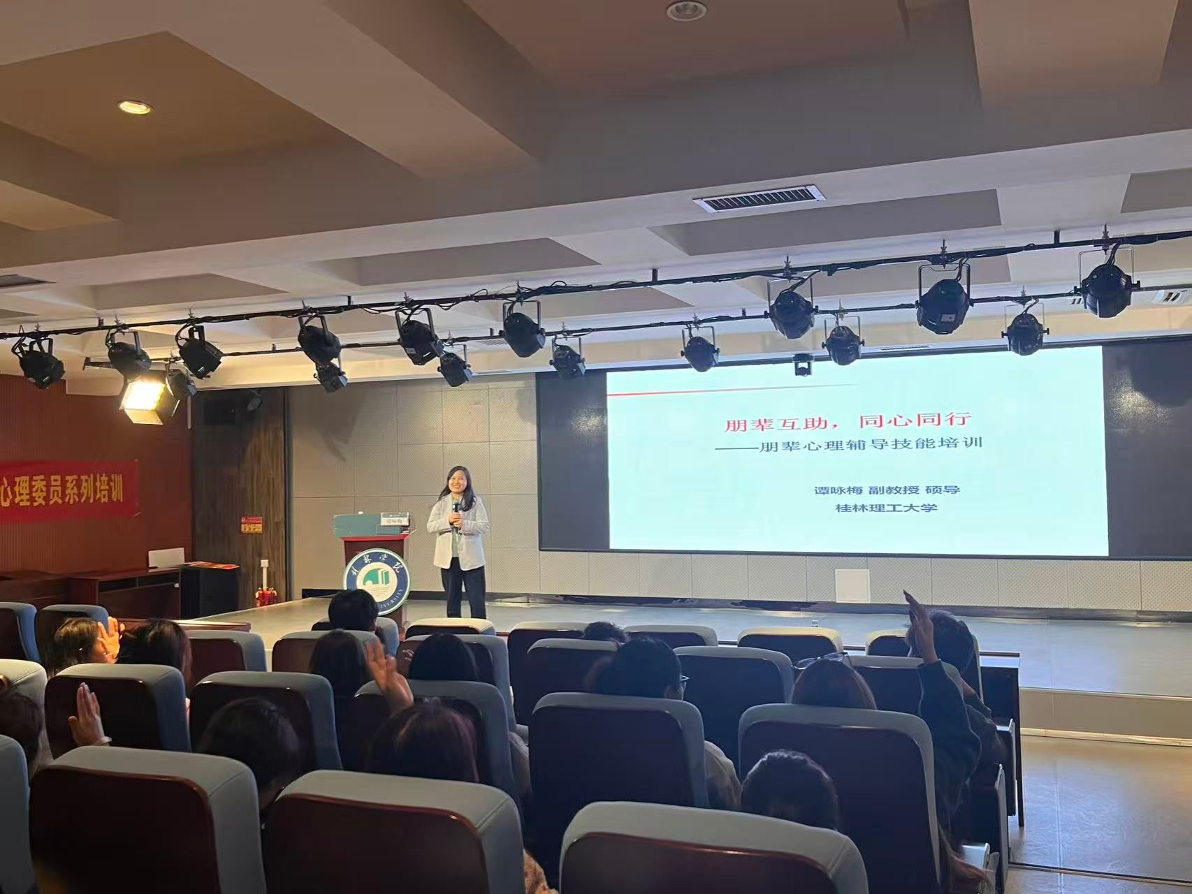 为提升班级心理委员与大学生心理健康协会成员的专业素养与助人能力,构建更加和谐、支持的校园心理环境,11月4日学生心理健康教育与咨询中心在至善讲堂组织开展了2025年秋季学期班级心理委员系列培训第一场专题讲座——朋辈心理辅导技能。本次培训特邀桂林理工大学谭咏梅副教授主讲,2025级全体班级心理委员、大学生心理健康协会成员及部分专业宿舍长参加了本次讲座。