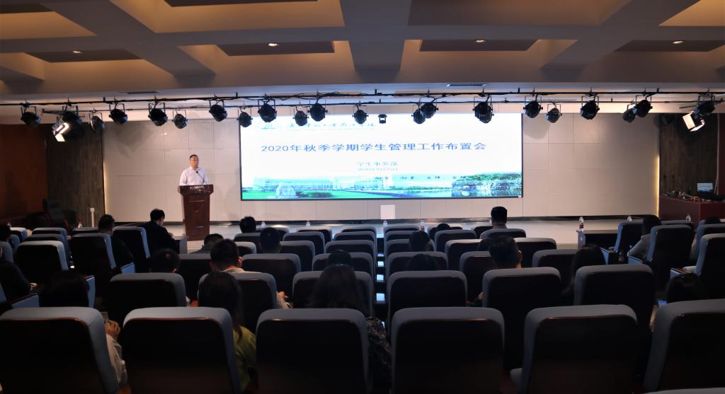 9月25日上午,我校在至善讲堂召开2020年秋季学期学生管理工作布置会。各二级学院分管学生工作副书记,全体辅导员,学生事务部全体成员参加,会议由学生事务部部长蒋远宏主持。