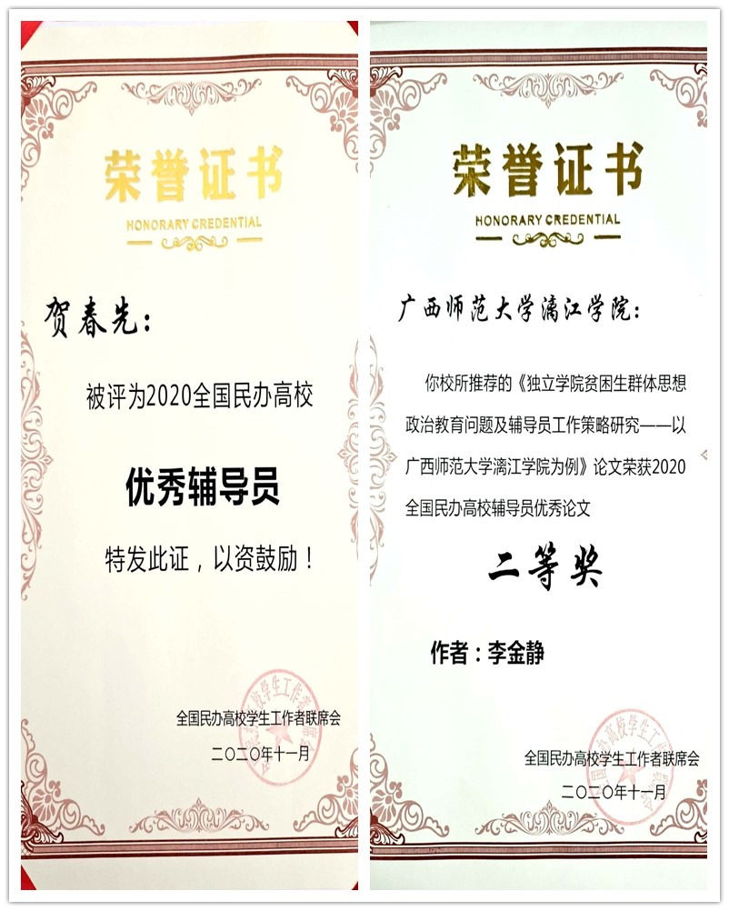 11月21-22日,第六届全国民办高校辅导员工作高峰论坛在杭州隆重举行,来自全国的215所民办高校430余名学生工作专家、民办高校学生工作主管领导及骨干辅导员参加此次高峰论坛。我校团委书记、二级学院党总支副书记及辅导员代表共8人参会。会上,我校辅导员贺春先荣获2020年“全国民办高校优秀辅导员”荣誉称号,李金静获得全国民办高校辅导员优秀论文二等奖。