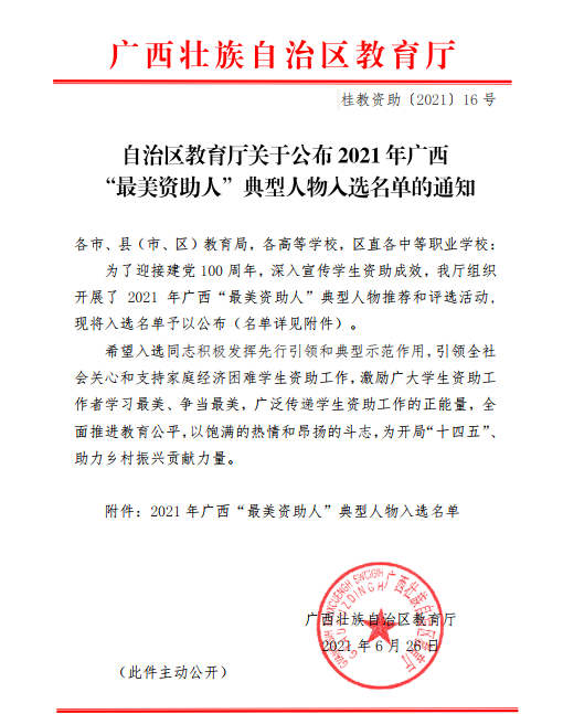 为庆祝中国共产党建党100周年,深入宣传学生资助成效,自治区教育厅组织开展了2021年广西“最美资助人”典型人物推荐和评选活动。根据《自治区教育厅公布关于2021年广西“最美资助人”典型人物入选名单的通知》(桂教资助﹝2021﹞16号)精神,我校马克思主义学院院长张常永入选“最美资助人”典型人物。
