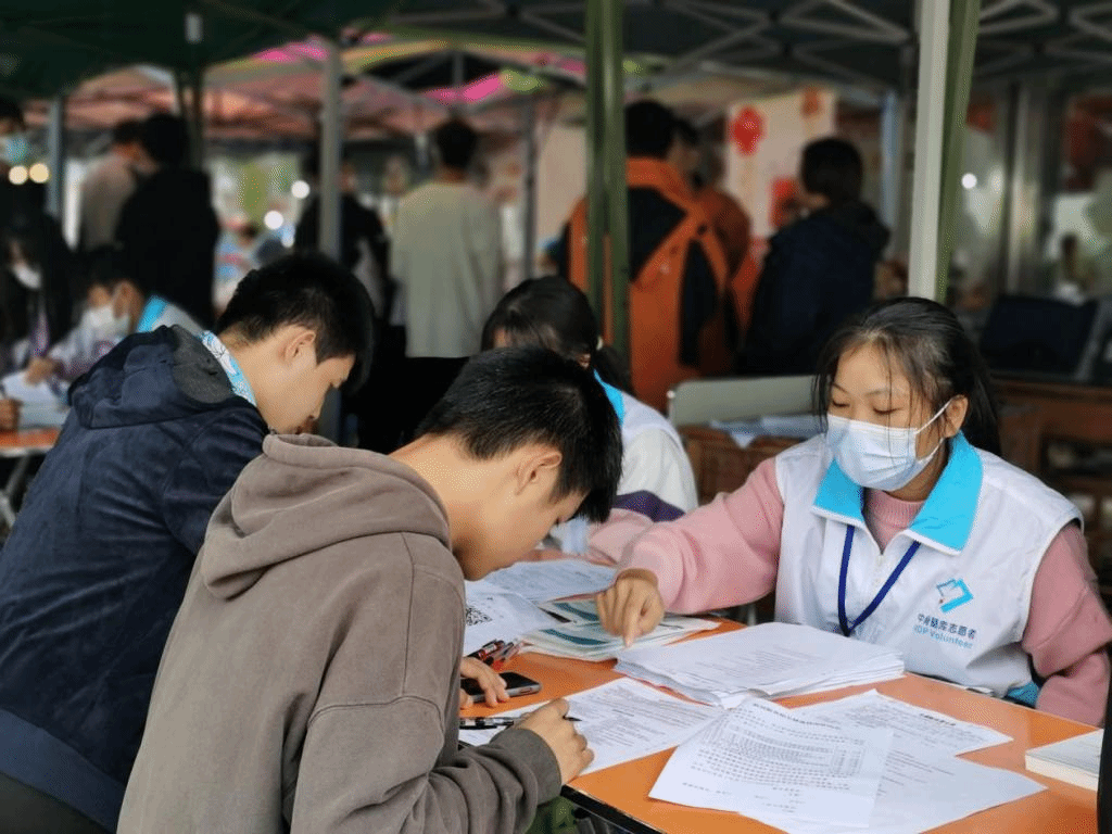 图:无偿献血现场学生志愿者为同学解答疑惑