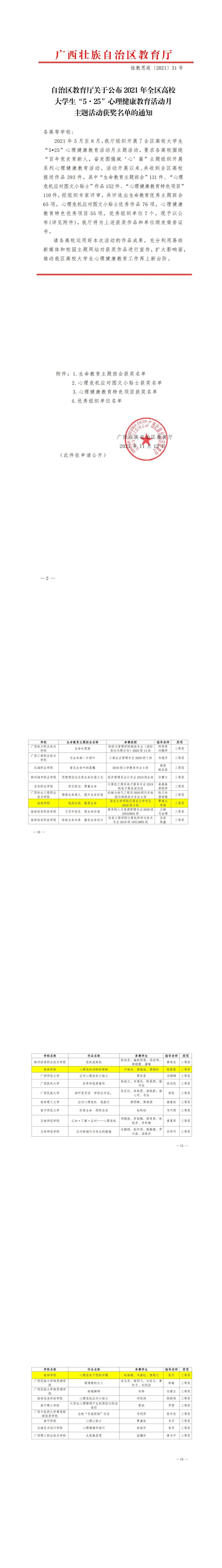 近日,根据自治区教育厅下发的《自治区教育厅关于公布2021年全区高校大学生“5·25”心理健康教育活动月主题活动获奖名单的通知》(桂教思政〔2021〕31号),经组织专家评审,我校共有3项作品获奖。其中,心理危机应对图文小贴士作品《心理危机消除的策略》获二等奖、《心理危机干预的步骤》获三等奖;生命健康教育主题班会《悦纳自我 敬畏生命》获三等奖。