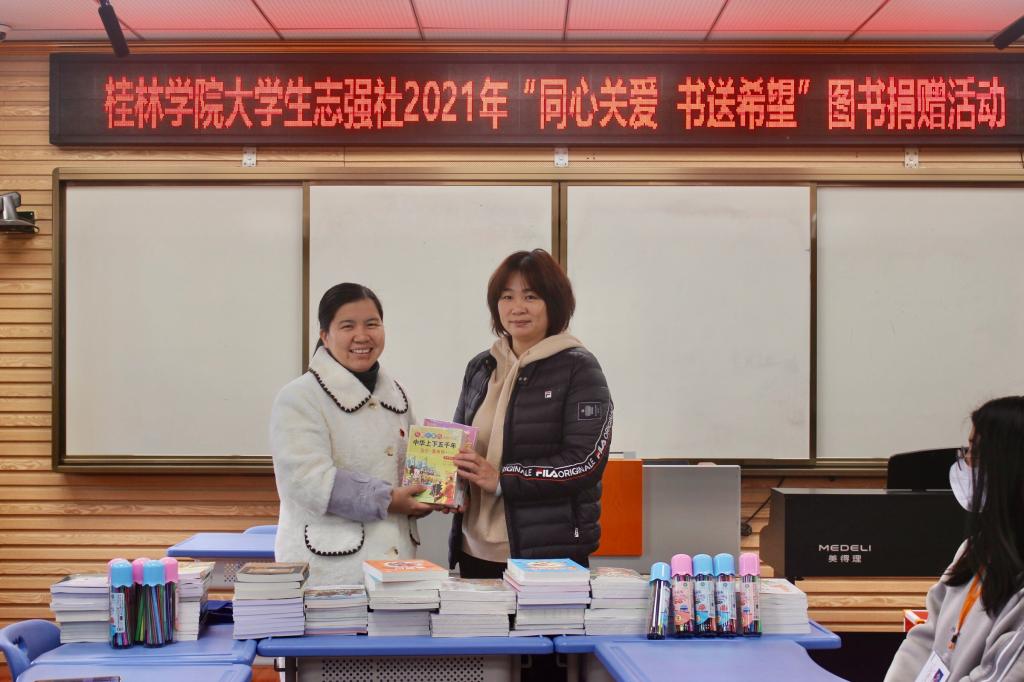 书作为人类进步的象征,它拥有着强劲的感染力和渗透力,传递着人与人之间的温情。2021年12月6日上午,学生事务部组织我校大学生志强社青年志愿者们前往位于雁山镇周家村的三合小学,开展了“同心关爱,书送希望”图书捐赠活动。