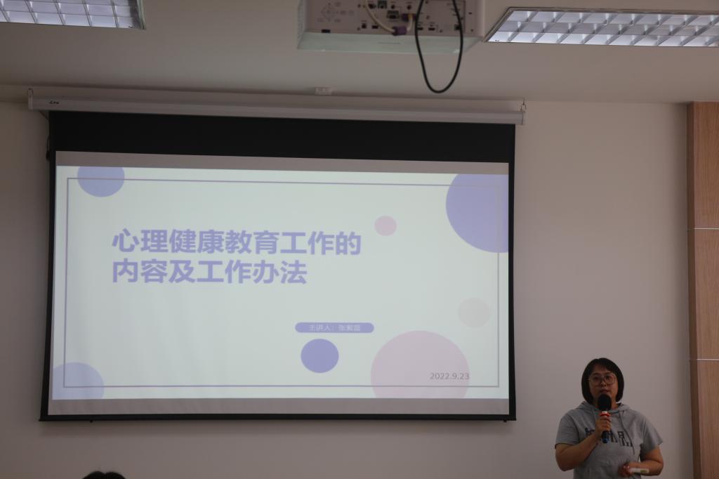 第二场主题是大学生心理健康教育,由学校大学生心理健康教育与咨询中心主任张紫晨主讲。她重点讲解大学生心理健康教育工作的注意事项及大学生心理危机干预工作基本流程,强调辅导员应注重学习大学生心理健康教育相关知识,以便更好地处理大学生的心理问题。