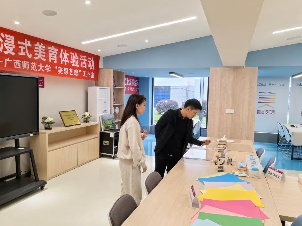 图:广西师范大学学工处蓝老师为江仿处长(左二)讲解“美思艺想”工作室