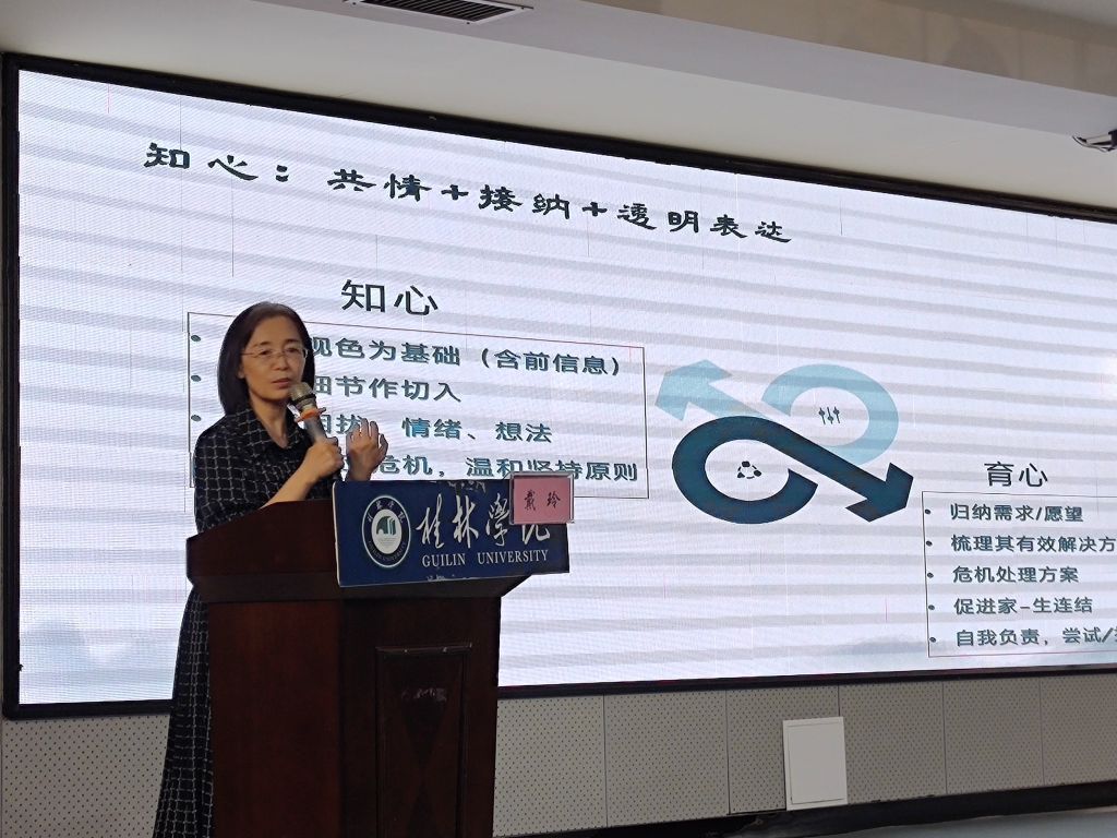 为进一步提升辅导员队伍的专业素质,增强辅导员谈心谈话能力,更有效地识别和解决学生心理问题,6月25日,学校于至善讲堂开展了2024年春季学期辅导员谈心谈话技能提升培训。培训邀请桂林医学院大学生心理健康教育与咨询中心专职教师、心理健康教育教研室主任戴玲教授主讲,我校各二级学院副书记、全体辅导员、心理健康教育专兼职教师参加会议。