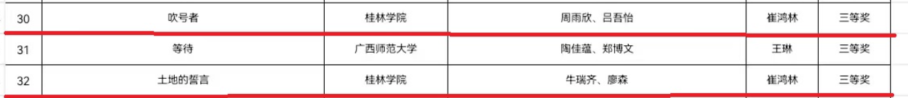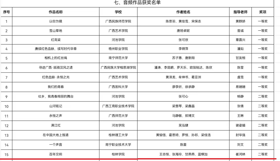 近日,根据《自治区教育厅自治区党委网信办关于公布第十届全区大学生网络文化节和2024年全区高校网络教育优秀作品推选展示活动获奖名单的通知》(桂教思政〔2024〕30号),我校在本次活动中音频作品获二等奖1项,三等奖2项;微电影作品三等奖1项,是学校在历届该项活动上取得的最好成绩。