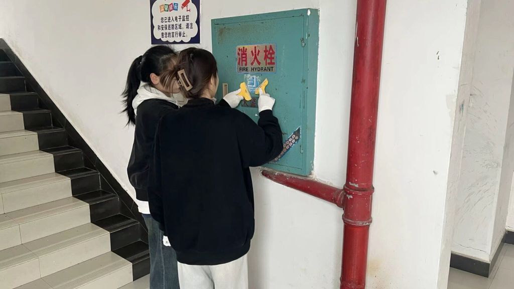 学生志愿者清消火栓上粘贴广告