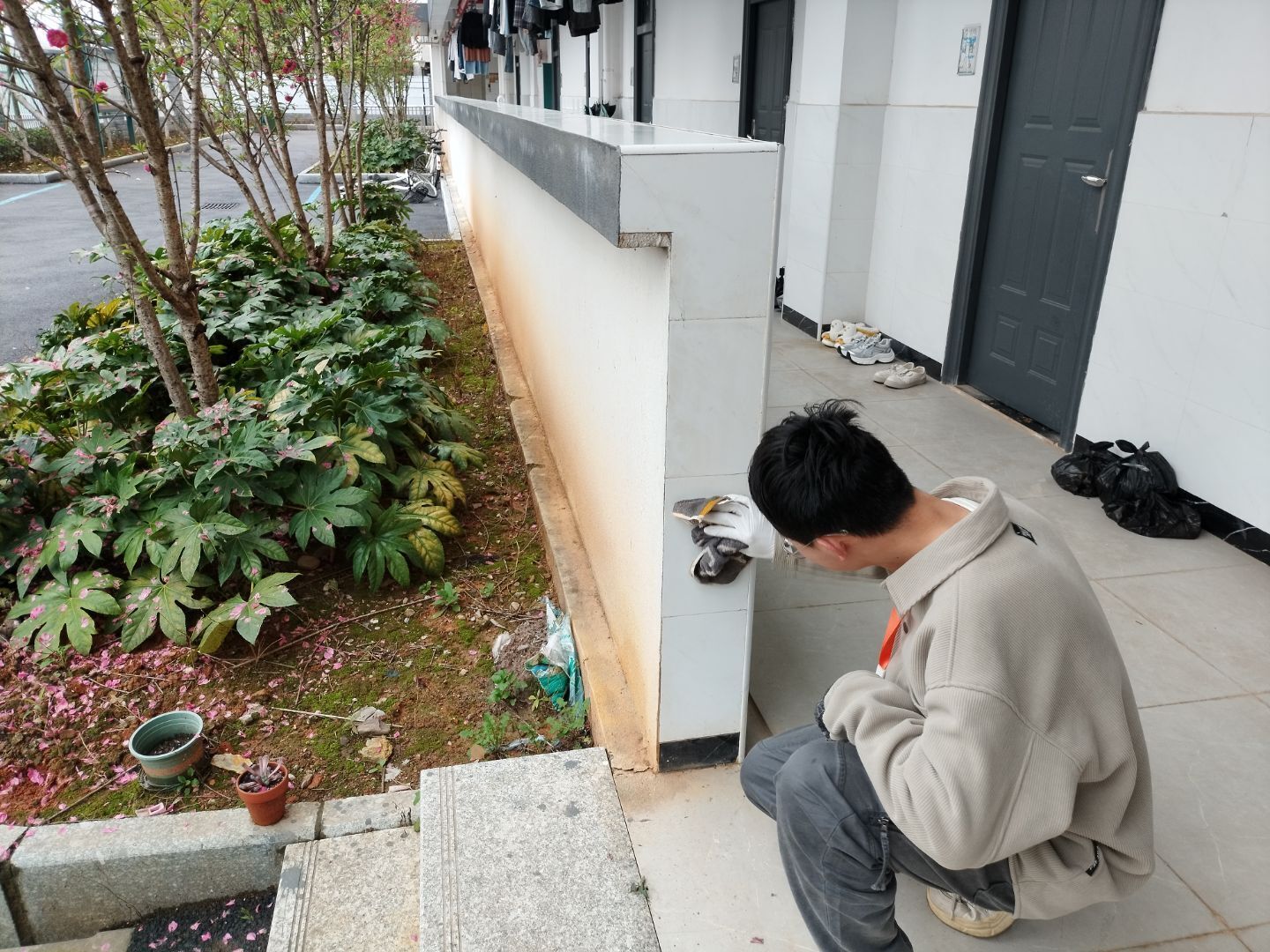 学生志愿者清理墙面污渍