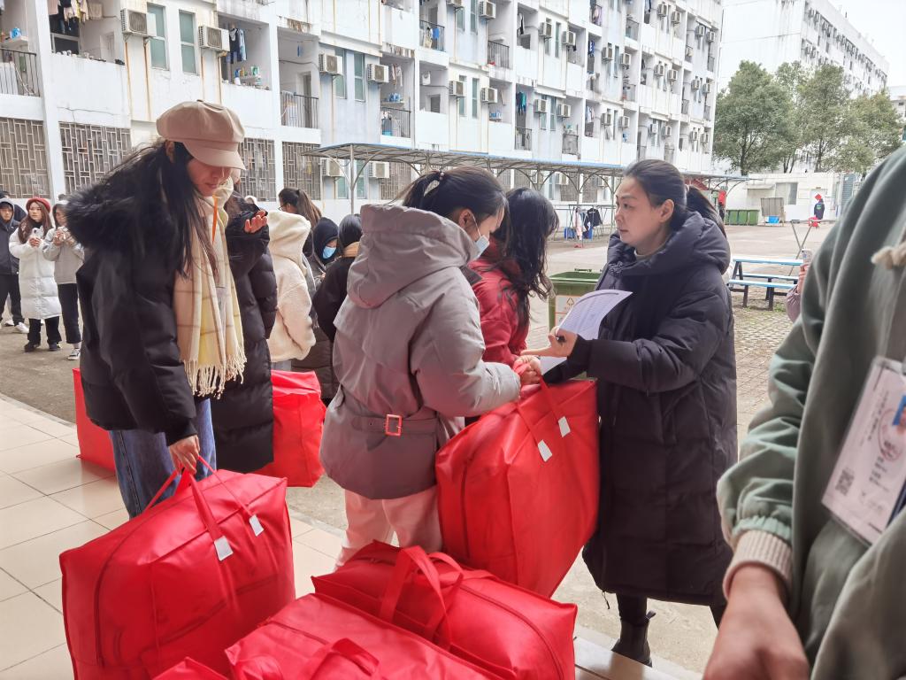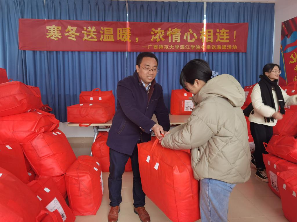 图:学生事务部部长蒋远宏为学生发放棉被