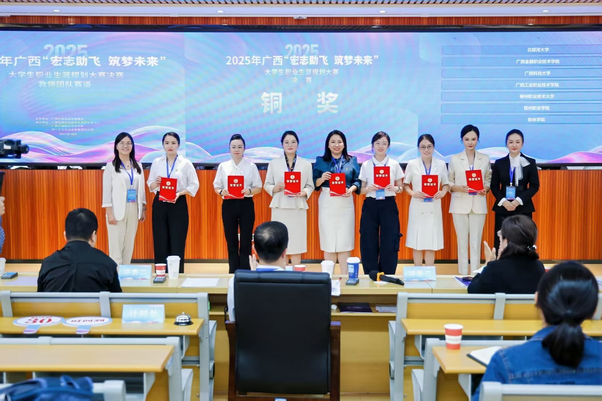 在此次赛事中,我校黄淑娟、傅秋月、石盼盼三位教师组成的团队成功突围,入选决赛。团队以《强生涯规划之基 创民办育人新径》为核心,围绕“大学生职业发展与就业指导”课程建设的优秀成果展开展示,最终凭借扎实的专业能力与鲜明的育人特色荣获铜奖。值得关注的是,本次教师赛道为广西大学生职业生涯规划比赛首次设立,这一成绩不仅是对我校教师专业水平的肯定,更充分彰显了我校在资助育人领域的探索成果与育人风采。