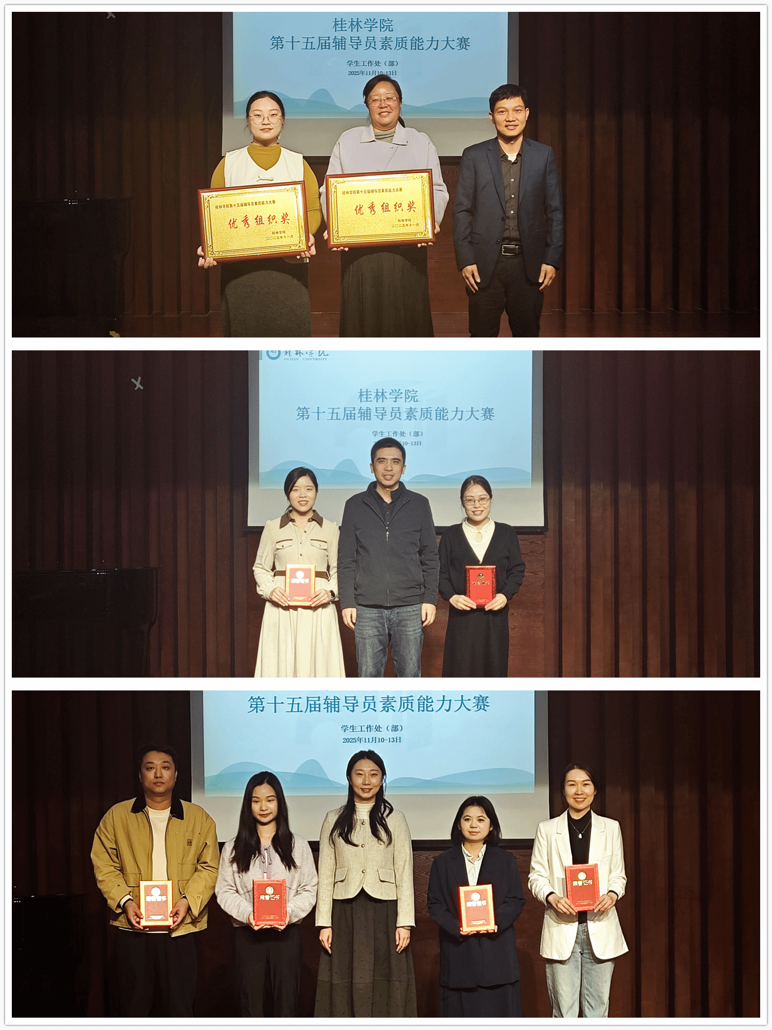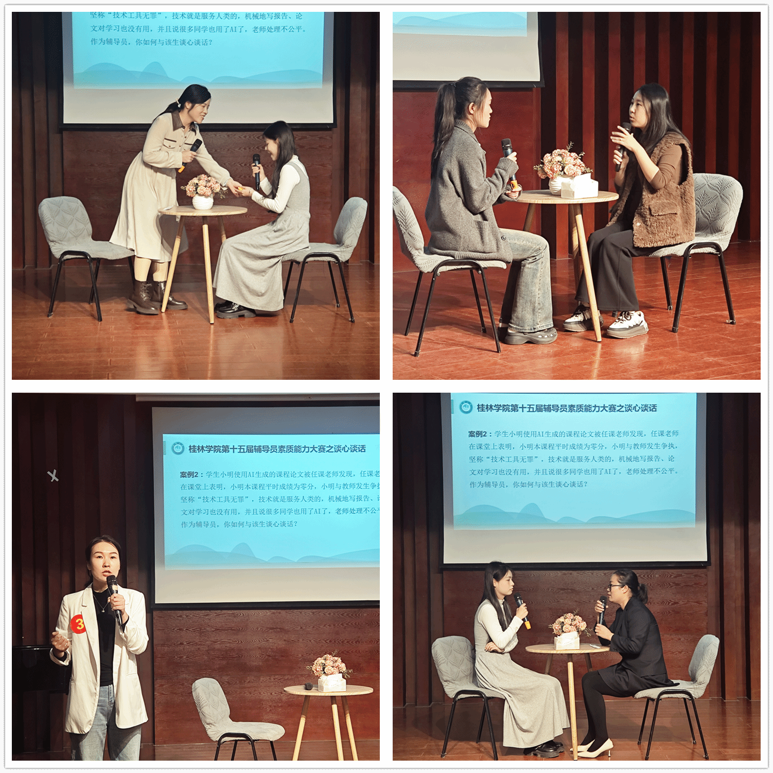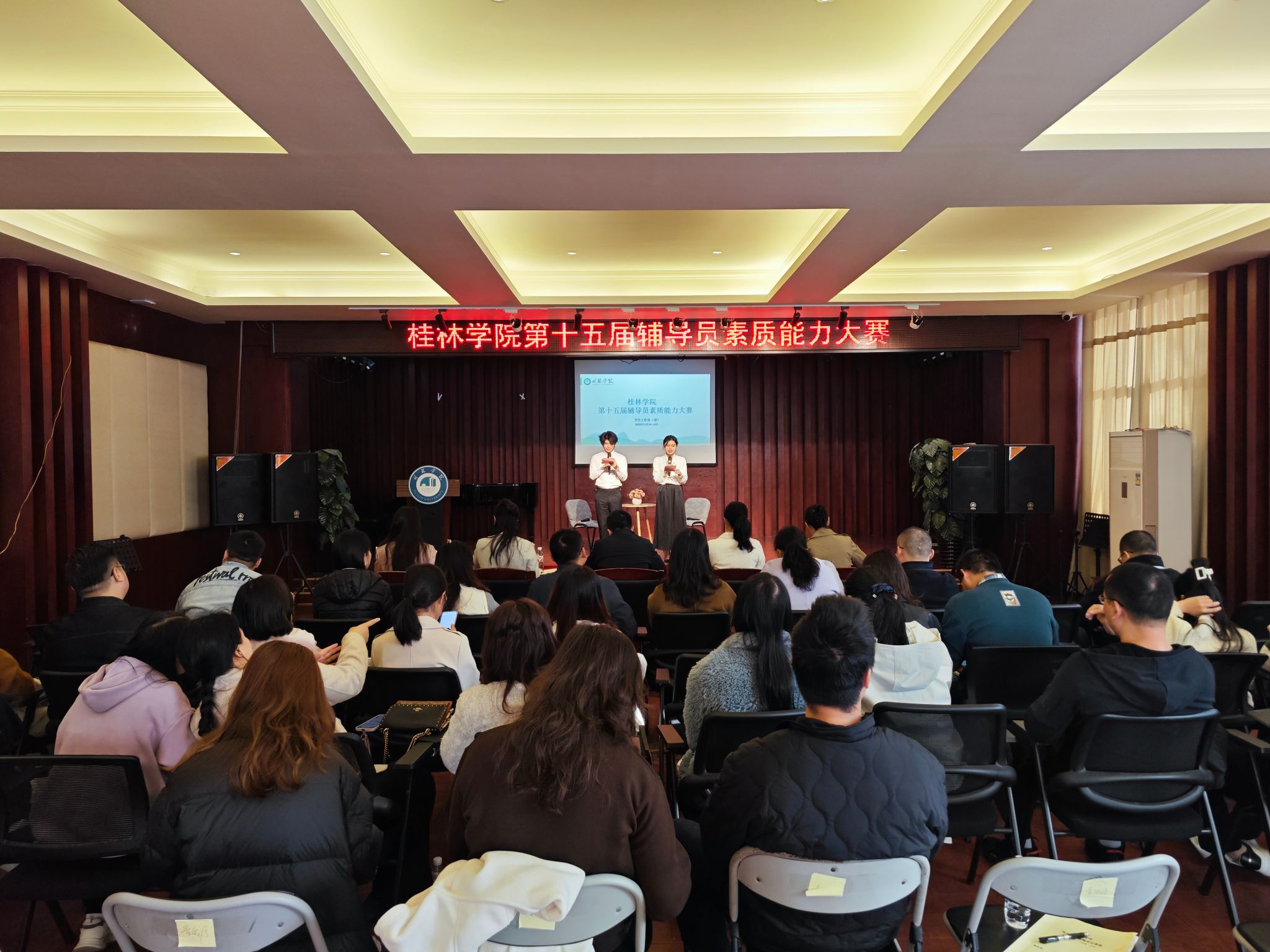 近日,我校第十五届辅导员素质能力大赛完成全部赛程。决赛特邀桂林理工大学公共管理学院党委副书记夏勇超,广西师范大学文学院/新闻与传播学院辅导员、第十四届广西高校辅导员素质能力大赛特等奖获得者胡悦,广西师范大学计算机科学与工程学院团委书记、第十四届广西高校辅导员素质能力大赛特等奖获得者冯绵绵,桂林电子科技大学机电工程学院团委书记、第十四届广西高校辅导员素质能力大赛特等奖获得者吴旭丹,桂林理工大学化学与生物工程学院团委副书记、第十四届广西高校辅导员素质能力大赛一等奖获得者张伟颀为评委嘉宾。全体辅导员参加比赛。