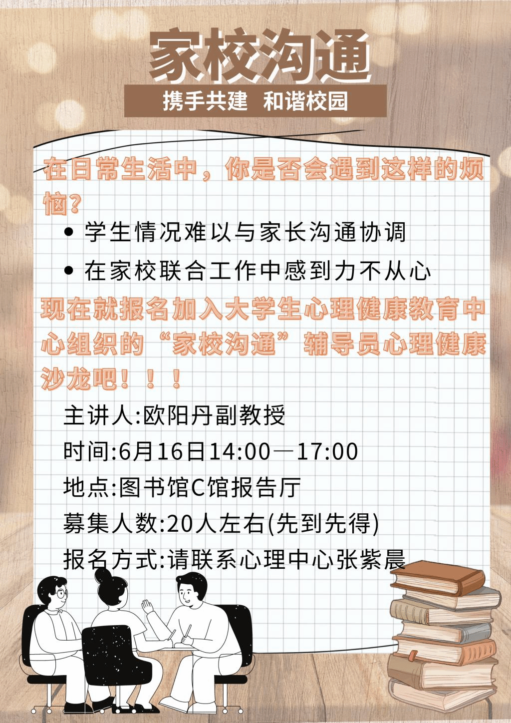 为提高辅导员处理学生心理危机事件时的胜任力,加强学校与家庭的联系,形成良好家校互助机制,共同为学生心理健康保驾护航。大学生心理健康教育与咨询中心拟于6月16日下午开展2022年“3·25”心理健康教育活动季——“家校沟通”辅导员心理健康沙龙。本次活动特邀请广西师范大学大学生心理健康教育中心副主任,副教授欧阳丹老师作为主讲人就家校沟通实务等内容进行讲解。具体活动安排如下: