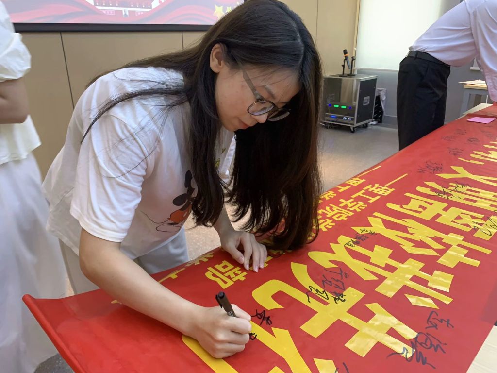 随后,毕业生党员代表黄曼向全体党员宣读“文明离校倡议书”,倡议毕业生党员在毕业离校前夕发挥先锋模范带头作用,引领全体毕业生在毕业季自觉配合学校工作,展现合格大学生良好的精神风貌。全体毕业生党员们在文明离校倡议横幅上签下姓名,写下承诺。