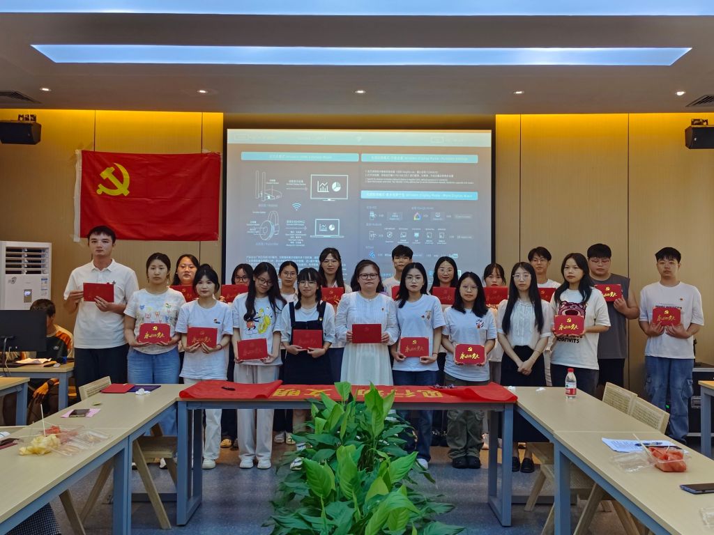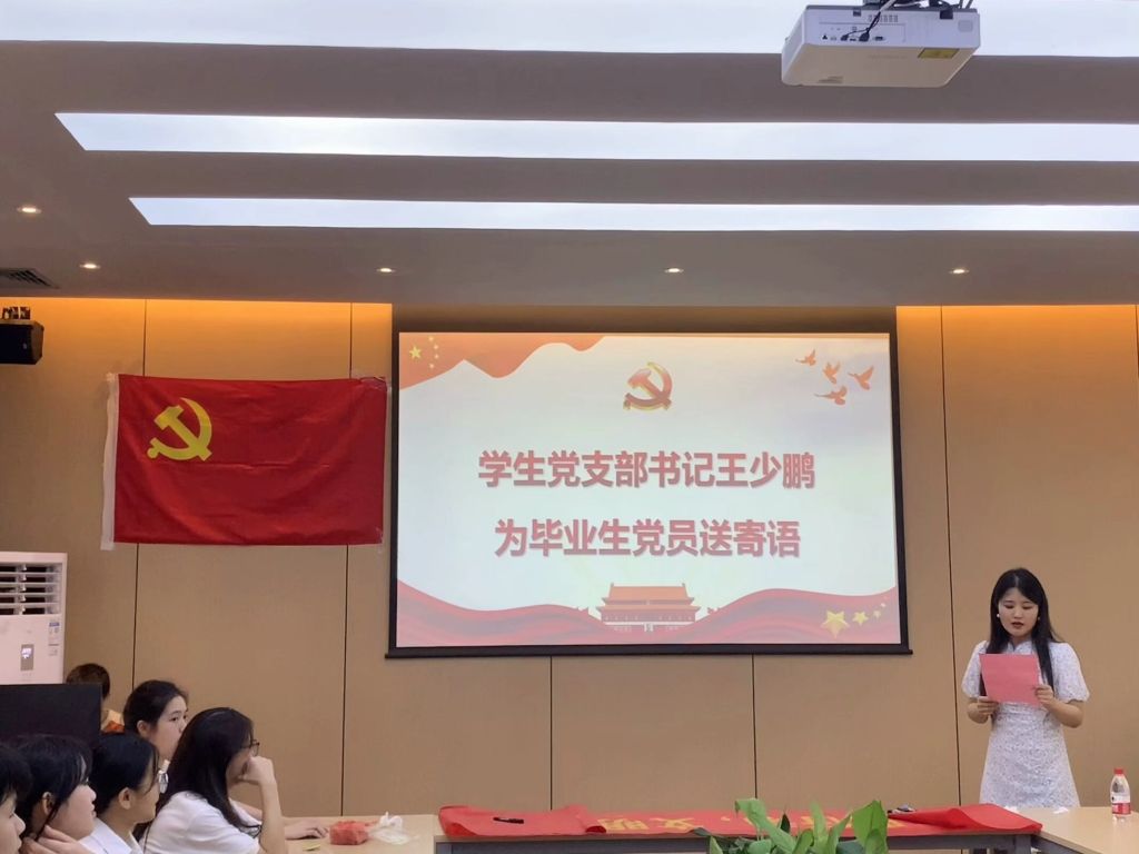 全体党员重温入党誓词。学生党支部书记王少鹏嘱托全体毕业生党员要努力培育“四颗心”:一是回望初心,坚定理想信念;二是坚守真心,加强党性修养;三是磨砺匠心,提高专业能力;四是愉悦身心,快乐工作健康生活。学生社区党支部书记黎金丽代表支部为毕业生党员送“政治生日卡”,送上祝福,希望大家历尽千帆,仍有少年凌云志!随着歌曲《晴天》响起,黎金丽老师将刻有全体党员名字的蛋糕缓缓推出,大家纷纷上台同蛋糕合影留念。