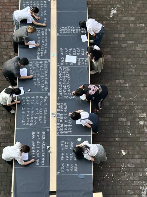 决赛中,选手们聚精会神书写粉笔字长卷轴,他们的书写内容合并起来是一首完整的《校园廉洁三字经》。活动承办单位理工学院学生党支部负责人介绍,本次活动将师范生“三字一话”基本功大赛与红色文化、廉洁文化相结合,旨在发挥党建引领作用,将思想政治教育融入学生职业技能培养,实现党建和教学的双融双促。