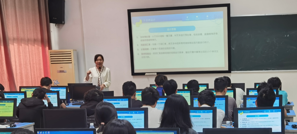 罗梦贞老师主讲的课程内容选自《Python编程》中的“组合数据类型一字典的应用”,授课对象为2022级软件工程1班。罗老师从中国四大名著之一的《三国演义》引入,强调民族团结的重要性,再以《三国演义》文本为教学素材,以统计英雄人名在文本中的词频为任务逐步推进教学内容。她根据工程化的思想,清晰地展现了解决问题的总体设计,并在逐个流程中穿插讲授知识点,逐个突破教学难点,整个教学过程设计合理,思政教育潜移默化,师生互动活跃,教学效果良好。