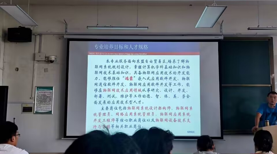 罗培中老师以“什么是物联网工程?”开篇,吸引了学生的注意力。活动中,罗培中对物联网工程专业培养的目标、人才规格、就业前景及开设的课程等进行了详细介绍,他着重强调物联网工程专业是以培养应用型人才需求为目标,打造“鸿蒙”物联网特色实践的计算机类专业。罗培中鼓励同学们保持对专业课学习热情,持续更新知识体系的同时,要加强物联网专业技能的培养,努力提升自己的专业能力以此来提高自己未来求职的核心竞争力。最后,罗培中给同学们留了一道思考题:在物联网专业的背景下,你的大学四年应该如何度过?