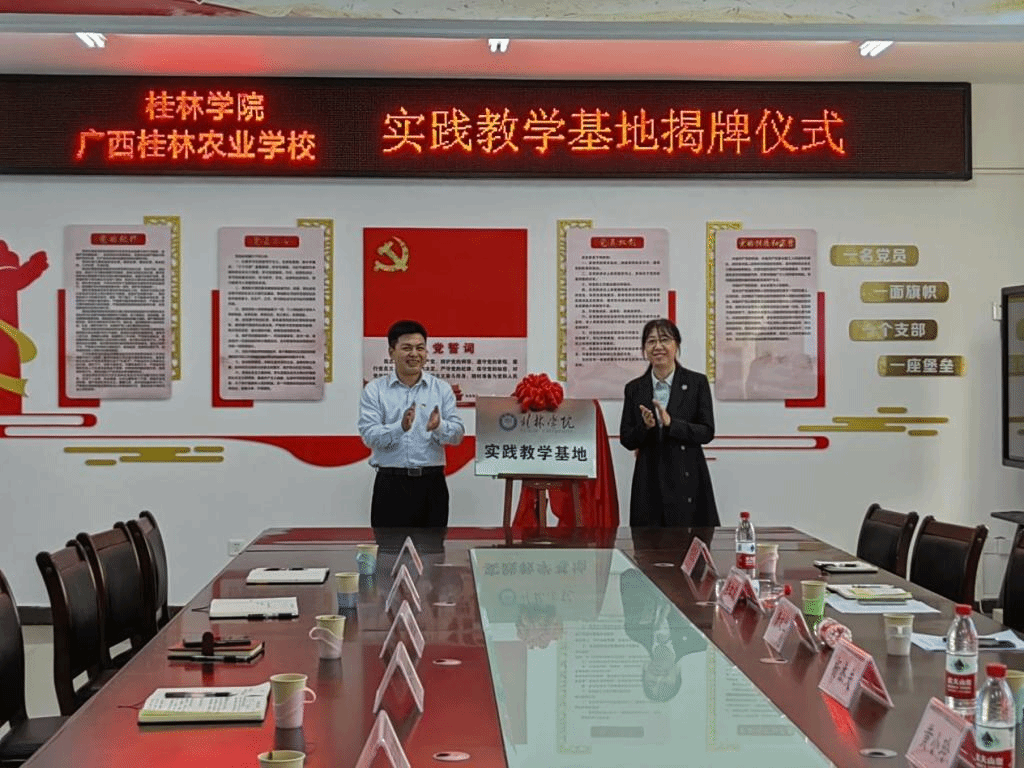 唐文红与广西桂林农业学校校长陈世富在双方教师见证下共同为实践教学基地揭牌,正式开启了两校合作共赢的局面。