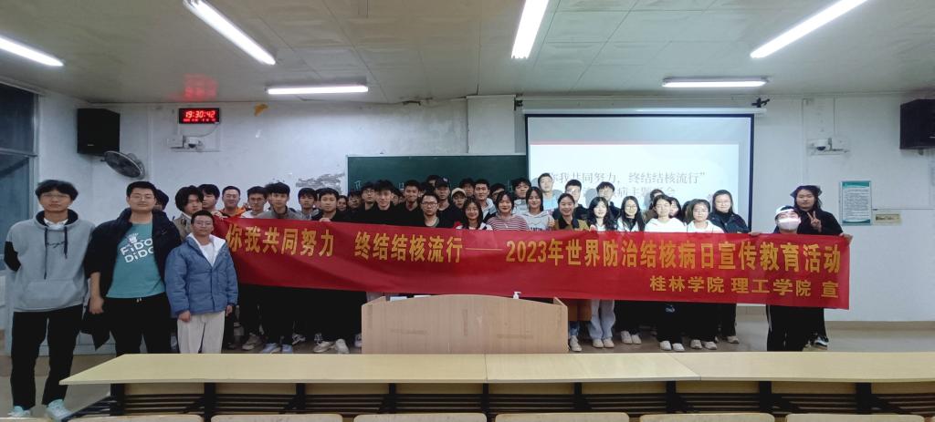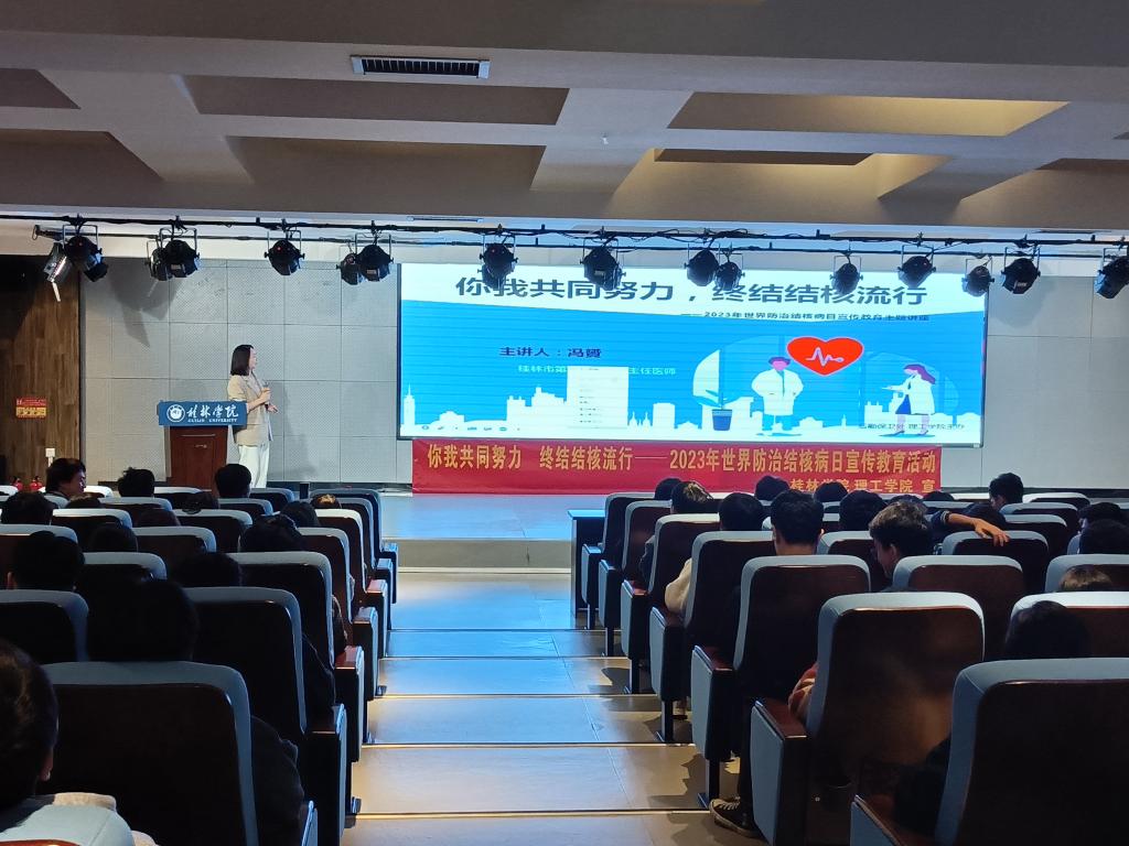 本次活动我院全体成员积极参与,紧扣“你我共同努力,终结结核流行”活动主题。我院各年级各专业因地制宜,拓宽宣传教育渠道,创新宣传教育载体,积极组织开展防治结核病宣传教育“三个一”活动,确保覆盖全体师生。“三个一”活动内容是:组织学生参加一次科普大讲堂或观看一次科普视频、开展一次主题班会(团日)活动、制作一期宣传板报(手抄报)。3月29日下午我院联合学校后勤保卫处特邀桂林市第三人民医院综合科主任医师冯贇在至善讲堂为学生们做“世界防治肺结核病日”的医学教育讲座。讲座中,冯主任着重讲解了肺结核病的危害以及如何预防肺结核病,学生们认真学习并记录下来。她介绍应该远离传染源,如果发现身边出现的疾病具有传染的性质,要及时远离,尽量少到人流聚集的地方逗留,避免被传染。冯主任还强调病毒携带者要及时治疗,减轻传染的可能性。另外,要保证居室的通风透气,给房屋进行定期的消毒,做到有效的预防结核病。