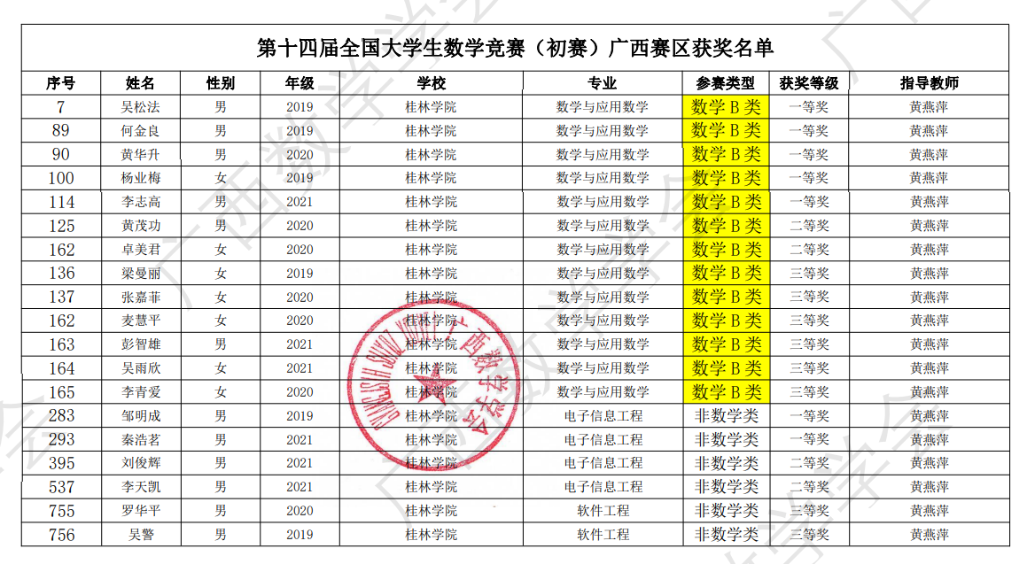 近日,2022年第十四届全国大学生数学竞赛(初赛)获奖名单已陆续公布。我校学子获广西赛区数学B类一等奖5项、二等奖2项、三等奖6项,非数学类一等奖2项、二等奖2项、三等奖2项。此外,我校教师李勇刚和张玉芳老师荣获“2022 年第十四届全国大学生数学竞赛”广西赛区优秀指导教师。