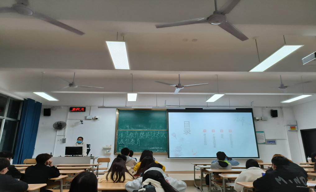 临近期末,正值刚过去的12月9日是国际反腐败日,为增强同学们的廉洁与诚信意识,培养良好品德,弘扬廉洁的清风正气,12月11日晚,我院2022级新生辅导员杨清棠在1215教室为2022级数据科学与大数据技术专业和2022级电子信息工程专业的同学开展了“廉洁教育暨期末考试诚信教育”主题班会。