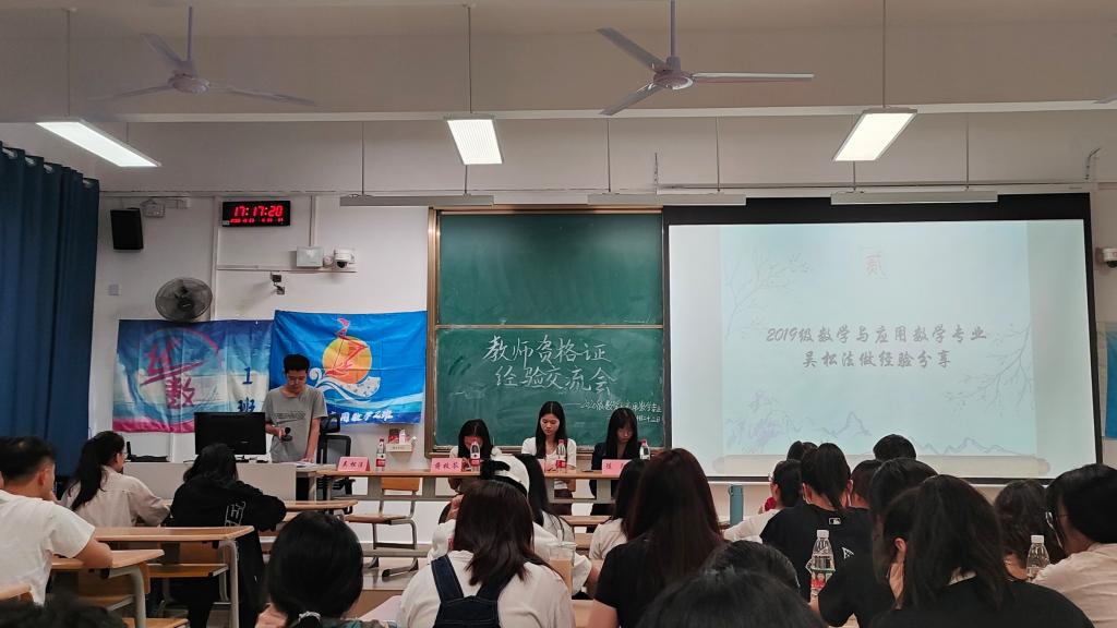 为帮助2020级数学与应用数学专业的学生熟悉教师资格证考试的相关内容,备考下学期的教师资格考试。10月22日晚,我院在至善楼1215教室举办了教师资格证考试经验分享会,交流会邀请了2019级数学与应用数学专业蒋枝芩、吴松法、杨业梅、陈阳等四位同学分享考证经验,2020级数学与应用数学专业全体学生参加了此次活动。