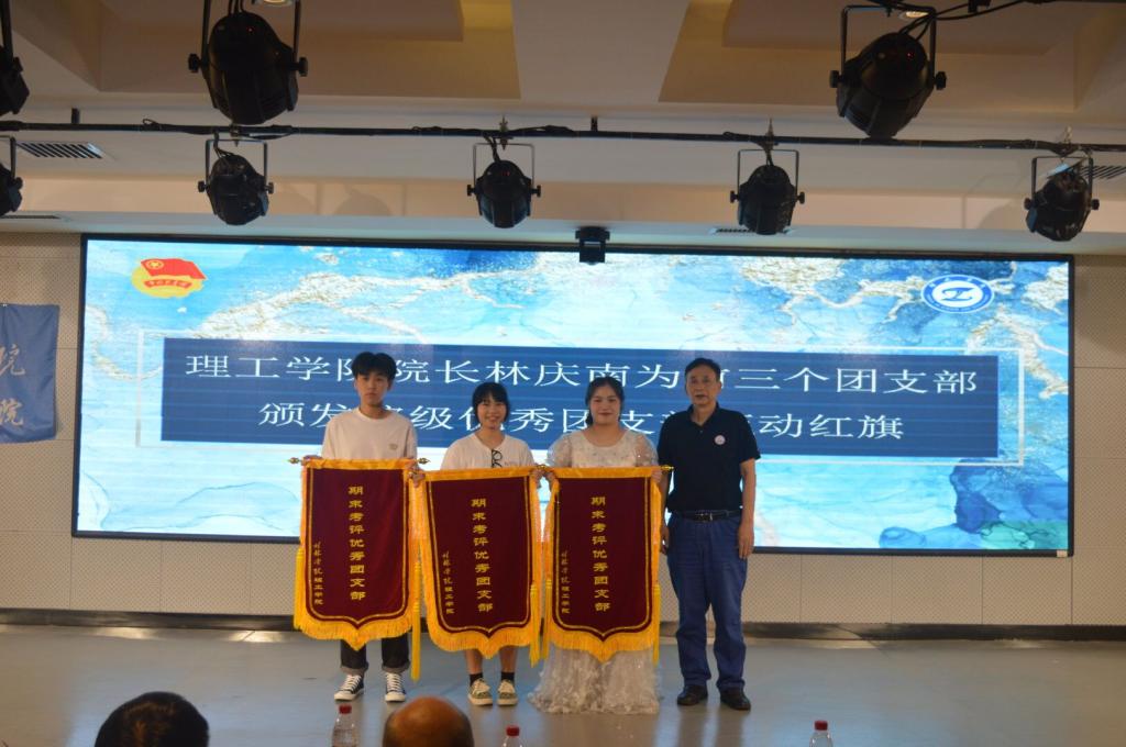 大会第二阶段为我院2021—2022学年第二学期团支部期末考评大会。团支部现场评比主要分为两个环节,一是各团支部代表上台进行陈述,以PPT形式汇报团支部本学期在思想建设、组织建设、学风建设、公益实践等方面的成果,二是才艺表演环节,同时,展示各团支部的文本材料。大会气氛活跃,严肃活泼,各团支部代表的陈述和他们的作品展示、文艺表演获得了同学们和老师的热烈鼓掌。经过综合现场展示和材料评比两个部分的得分,最终,2020级数学与应用数学第一团支部和2021级软件工程第二团支部得分最高,并列第一名,2019级数学与应用数学第三团支部获得第三名,理工学院院长林庆南为获奖团支部颁发了院级优秀团支部流动红旗。