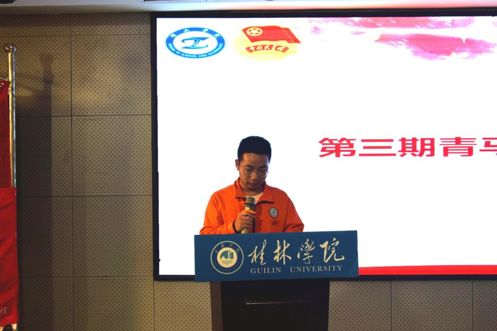 最后,本期青马班优秀学员代表姜来同学发言,他介绍自己于2021年9月加入青马班,在这过程中学到了许多。他表示,作为新时代的青年学子们要珍惜这来之不易的机遇,充满自信,努力奋斗,成长为中国特色社会主义事业的合格建设者和可靠接班人,为中华民族伟大复兴做贡献。