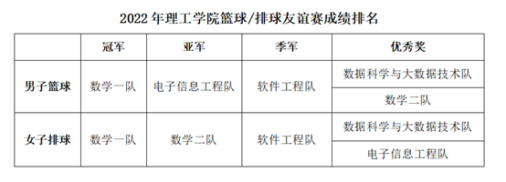 为进一步丰富我院学生校园文体生活,促进各专业学生之间的交流,培养学生团结拼搏、勇于争先的精神,理工学院于4月15日至5月4日,圆满举办男子篮球及女子排球比赛。经过近一个月的激烈角逐,数学一队夺得男子篮球、女子排球赛冠军,电子信息工程队夺得男子篮球赛亚军,数学二队夺得女子排球赛亚军,软件工程队夺得男子篮球、女子排球赛季军。