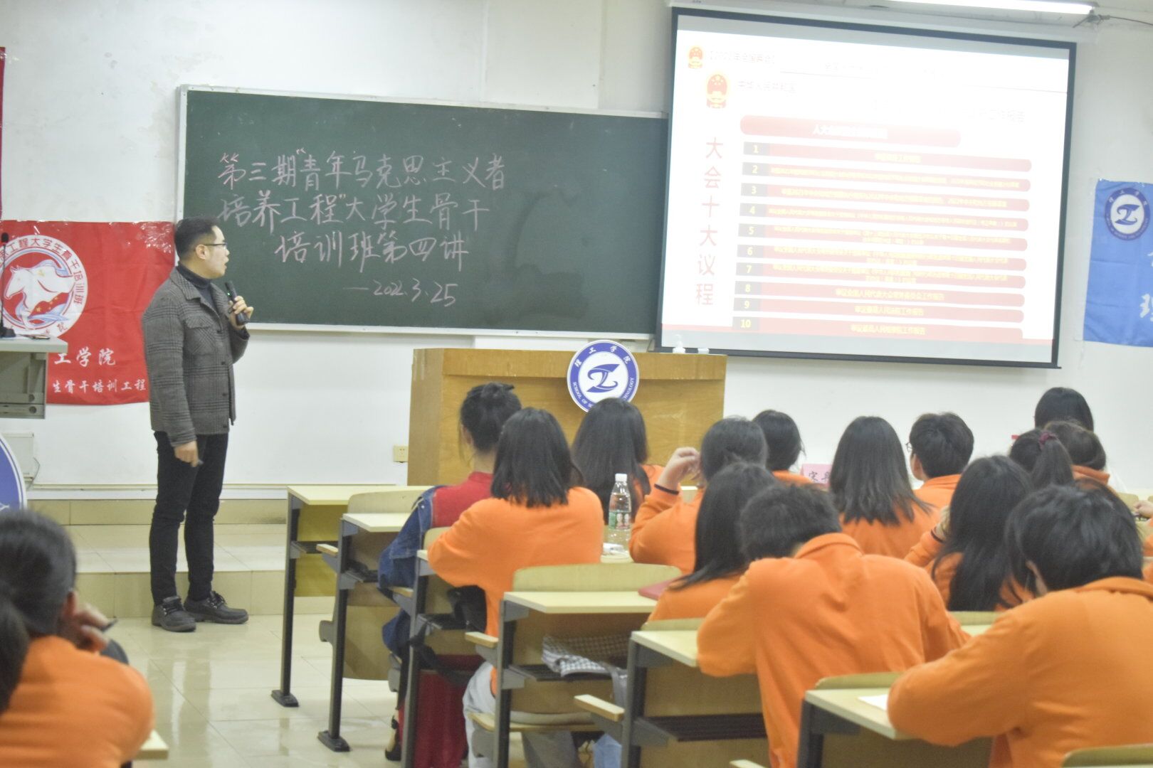 为使我院“青年马克思主义者培养工程”大学生骨干更好地学习贯彻全国“两会”精神,明白我国面临形势环境的复杂性和严峻性、肩负任务的繁重性和艰巨性,理工学院于3月25日在至善楼1104教室开展第三期“青年马克思主义培养工程”大学生骨干培训班理论授课第四讲活动。