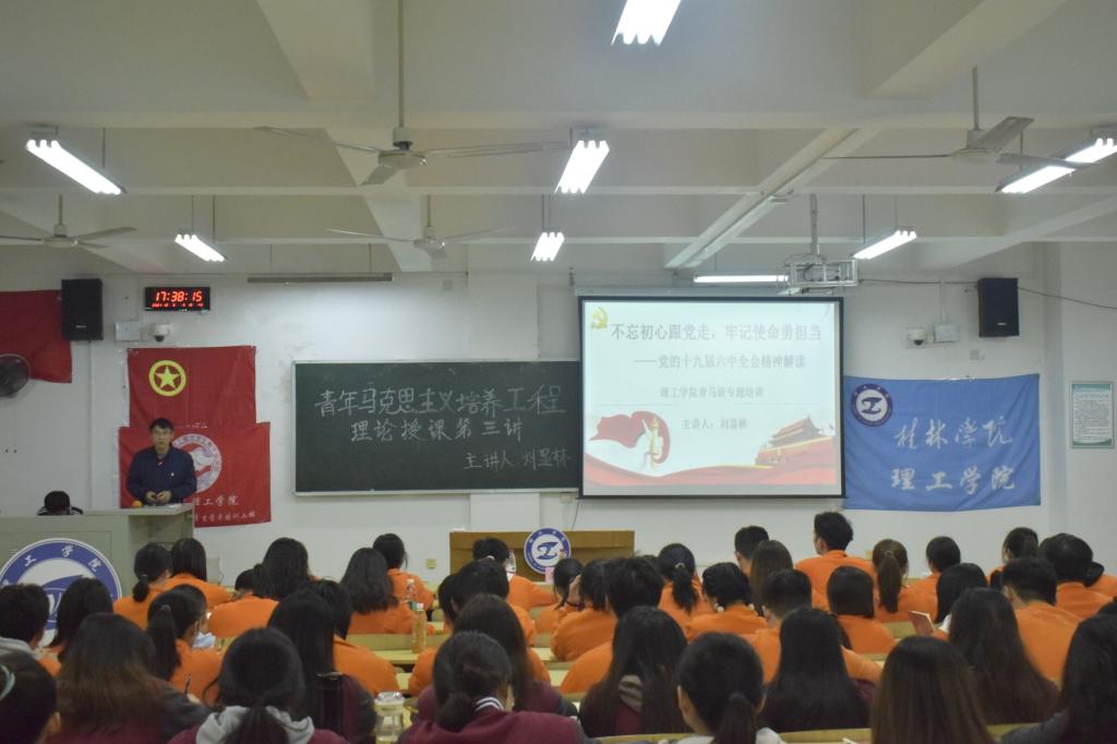 为了让青马班成员们更好地学习党的十九届六中全会精神,从党的百年奋斗历程中汲取智慧和力量,强化使命担当,扎实自身学习与工作,走好新时代的赶考之路,12月3日晚,理工学院在至善楼1104教室举办了第三期“青年马克思主义者培养工程”大学生骨干培训理论授课第三讲。出席本次活动的嘉宾有学生党支部书记刘显林、团总支书记李莉、团总支副书记蓝贤斯及考评干部们,本次活动由2021级数据科学与大数据技术专业的袁陈越主持。