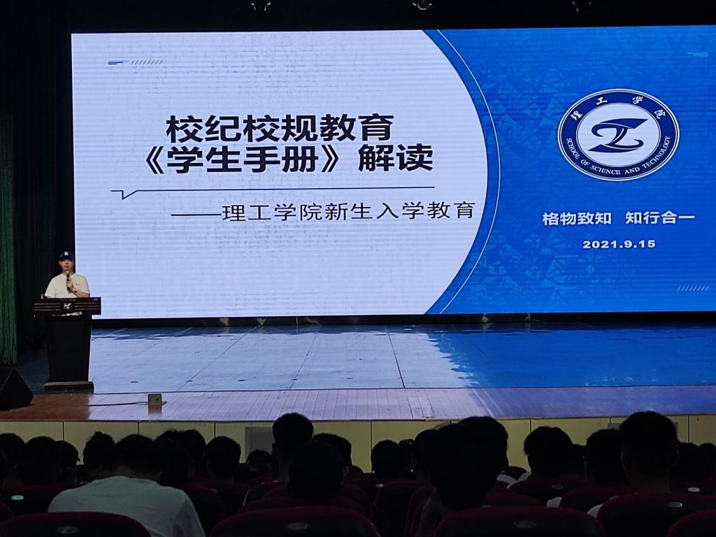 9月15日上午,理工学院2021级新生校纪校规教育之《学生手册》解读讲座在弘善讲堂举行,讲座由党总支副书记金云亮主讲,数学与应用数学、软件工程、数据科学与大数据技术、电子信息工程专业新生共398人到场聆听。此次讲座是为了让学生更早适应大学生活,了解校纪校规,平稳的度过大学四年。